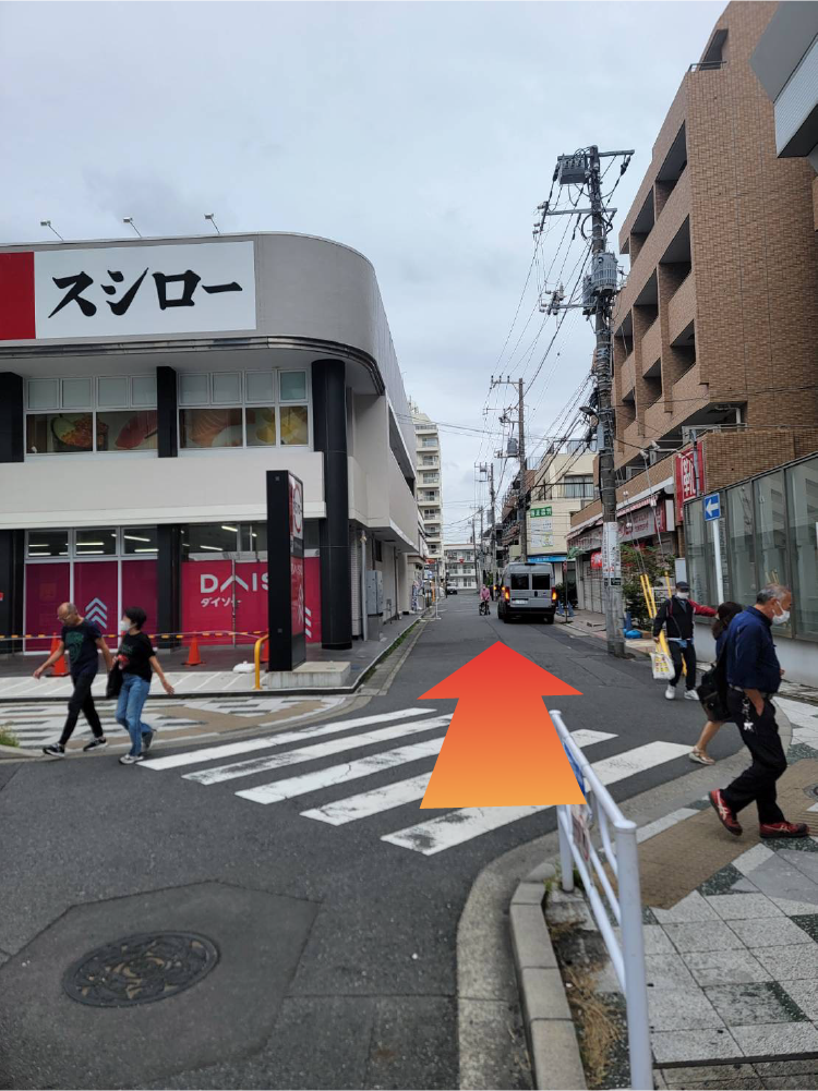 ⑥スシローがあるのでの、スシローを左手に見ながら脇道を直進します。